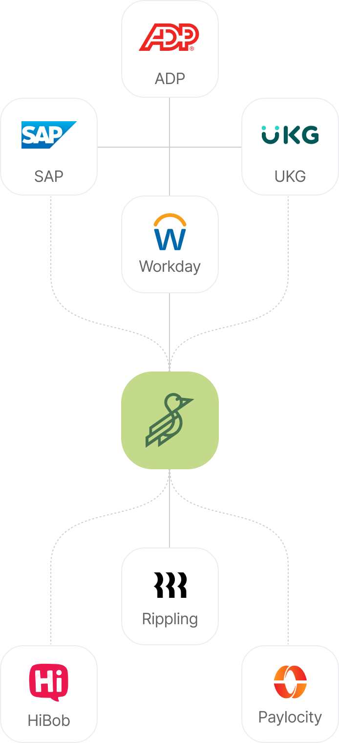 Compatible with 150+ HR and payroll platforms, from Workday to BambooHR, Rippling, Gusto, and more.