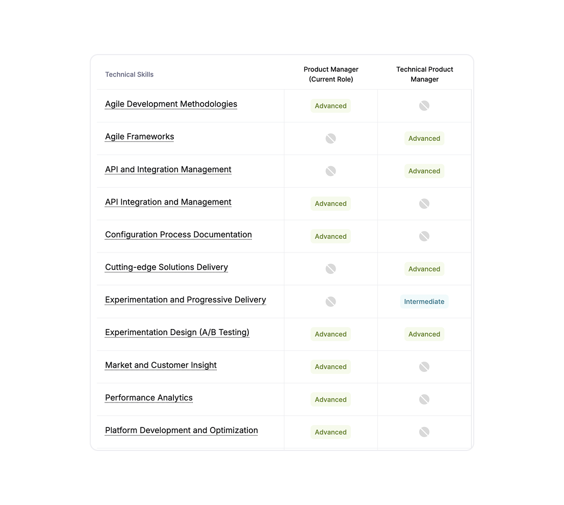 Provide clear, skills-based career pathways for your organization. Help employees compare roles across departments, levels, and job families — understanding what’s needed to move laterally or advance.